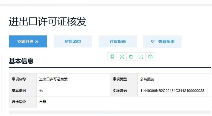 企业先登录深圳科技工贸和信息化委员会网站登记公司资料,网址为:http://www.gdzwfw.gov.cn/直接搜索:进出口许可证核发,点立即办理,如图:
