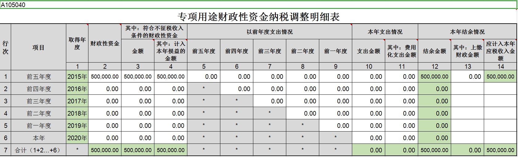 案例:某企业2015年取得财政性资金50万元,用于购买指定用途的专用设备,符合税法规定的不征税收入条件。该企业在2016年按免税收入政策进行了企业所得税年度申报,但是,这部分财政性资金一直未按规定用途购买设备。因此,在2020年进行2019年企业所得税年度申报时需要将这部分资金50万元进行纳税调增,计入应纳税所得额,需要填列A105040《专项用途财政性资金纳税调整明细表》,具体明细表内容如下: