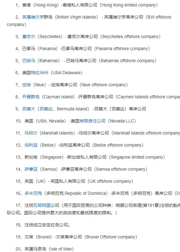 注册离岸公司可以选择以下地区: