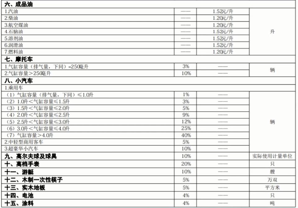以下是消费税税率表: